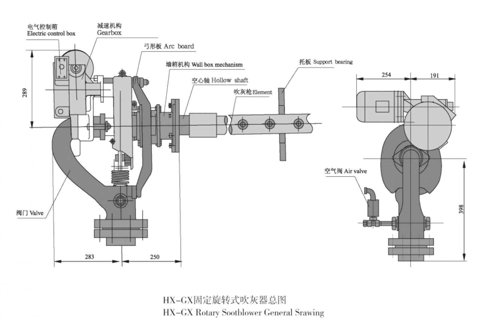 HX-GX soot blower is mainly composed of gooseneck valve, hollow shaft, soot blowing gun, reduction transmission mechanism and arcuate plate, electrical control box, furnace wall interface device, furnace supporting plate, etc.